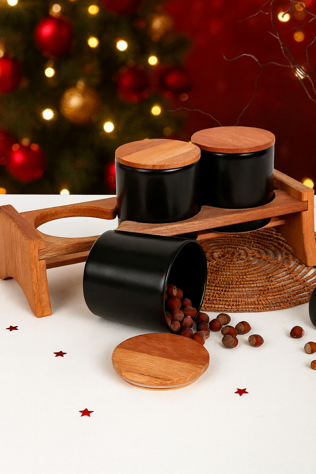 Kolay kullanımı ve zarif formu ile mutfaklarınızı süsleyecek Keramika Mat Siyah Ege Ahşap Standlı Saklama kapları, baharat ve bakliyatlarınızı saklamanın en şık yolu olacak. Özel renkleri ile size mutfakta büyük kolaylık sağlayacak. Ahşap kapağıyla tasarım bütünlüğü sağlayacak bu saklama kapları mutfaklarınızın en şık detayları arasında yer alacak.